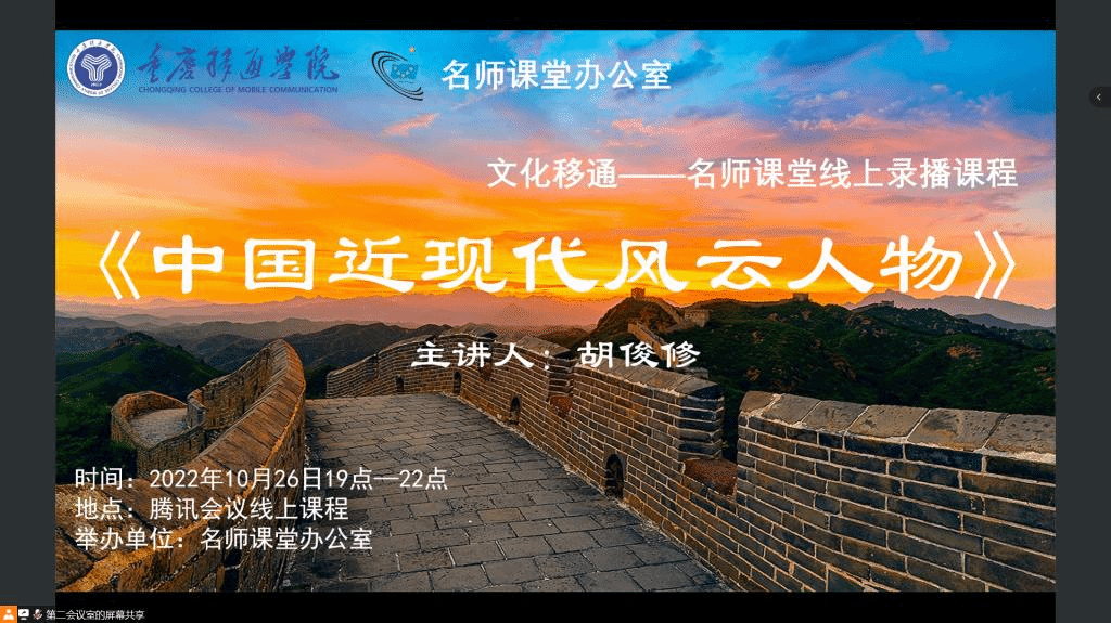 中国共产党从成立之初到建党已百年之久,从衰败凋零到如今的欣欣向荣。习近平总书记指出,我们党的一百年“是矢志践行初心使命的一百年,是筚路蓝缕奠基立业的一百年,是创造辉煌开辟未来的一百年”。10月26日晚7点,“名师课堂线上录播课程”播放了胡俊修老师的《中国近现代风云人物》,带领同学们回到百年前,走进中国共产党第一次全国代表大会。