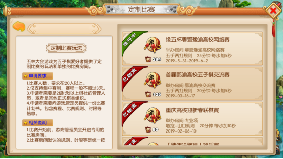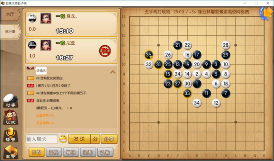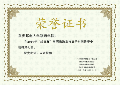 2019年6月2日由广东省围棋协会五子棋分会、湖北高校棋协委员会、河南省高校棋类协会、重庆市高校棋牌联盟会主办,重庆邮电大学移通学院逸轩棋社协办的“缘五杯”粤鄂豫渝高校五子棋网络赛圆满落幕。本次比赛历时3天,涉及4个省份43支队伍共129人参加。