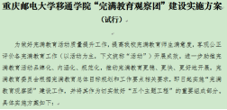 6【完满教育观察团】为做好完满教育活动质量提升工作,提高我校完满教育师生满意度,客观公正评价各完满教育工作开展成效,进一步助推完满教育活动品牌化、内涵化、规范化,推动完满教育更稳、更快、更好地开展,我校于10月印发《重庆邮电大学移通学院“完满教育观察团”建设实施方案(试行)》,方案对观察团工作对象、工作任务、团队建设、评价原则等问题进行了详细描述,同时,同步印发了《重庆邮电大学移通学院“完满教育观察团”成员招募通知》对观察团成员进行招募。