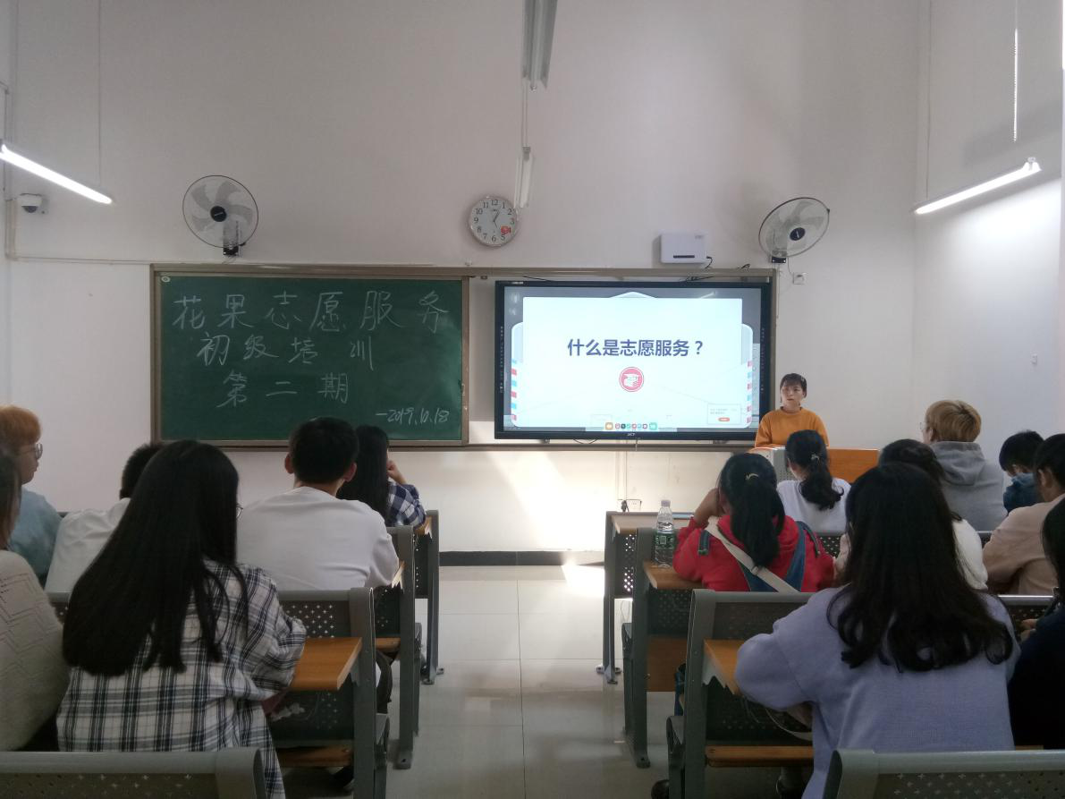 本月花果志愿服务初级培训第二期如期举行,我们邀请了上届外语系青年志愿者协会的主席为青协的干部干事讲解了她在志愿服务这条道路上的心路历程。通过精心准备的PPT和视频让他们对志愿服务有了更深一步的了解,提高了他们的志愿服务意识。