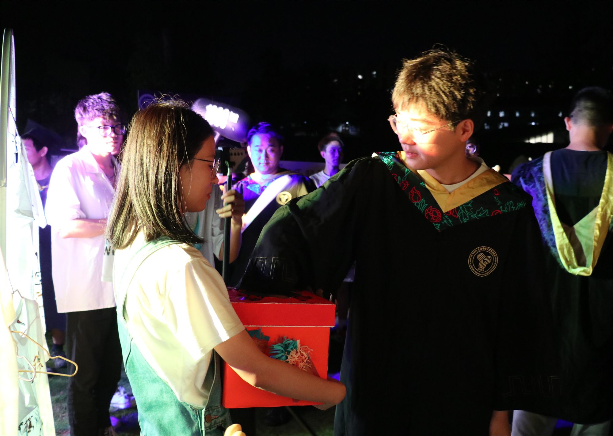 2023届车辆工程(专升本)苏德胜、郑吉水同学担任活动主持人,首先由学生乐队“夏日再现”送上《茶底世界》、《兰州兰州》两首歌曲。随后,主唱张振冬同学祝福所有的学长学姐们毕业快乐,前程似锦。来自2023届机器人工程专业的程俊豪同学演唱歌曲《雪》,黄预迁同学演唱歌曲《路过人间》,舒缓悠扬的歌声让人身临其境。为让大家在最后的校园时光更加亲近,组织了抢凳子游戏,大家积极踊跃地参加游戏,拉近了彼此之间的距离,现场氛围欢乐无限。