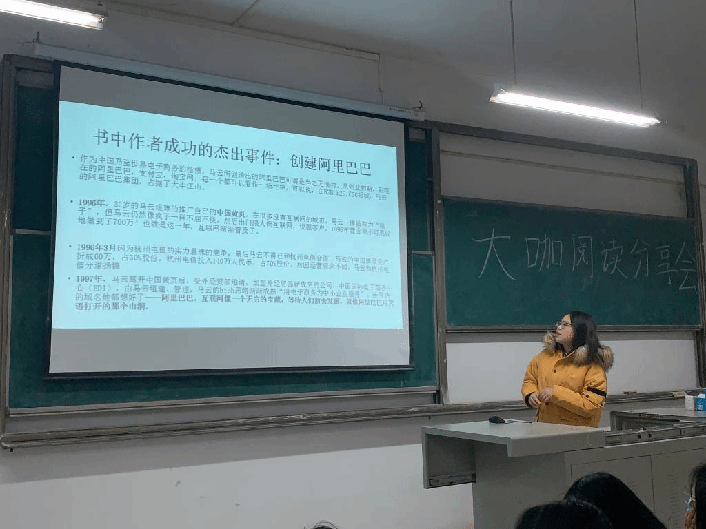 接下来是何杰同学分享《马云:未来已来》。她首先分析了马云的成功史,并结合社会热点话题,分享自己的观点。感概马云成功的同时,何杰同学提出:要怎样创业才能成功?陈绍卿同学通过分享自己的创业思想和创业路,热心解答了何杰的疑惑。陈同学强调,我们二十多岁的年纪,缺乏社会经验,但我们有初生牛犊不怕虎的勇气和魄力。这是我们创业成功最好的助推剂。何同学和陈同学的互动交流,引起在座同学的深度思考。