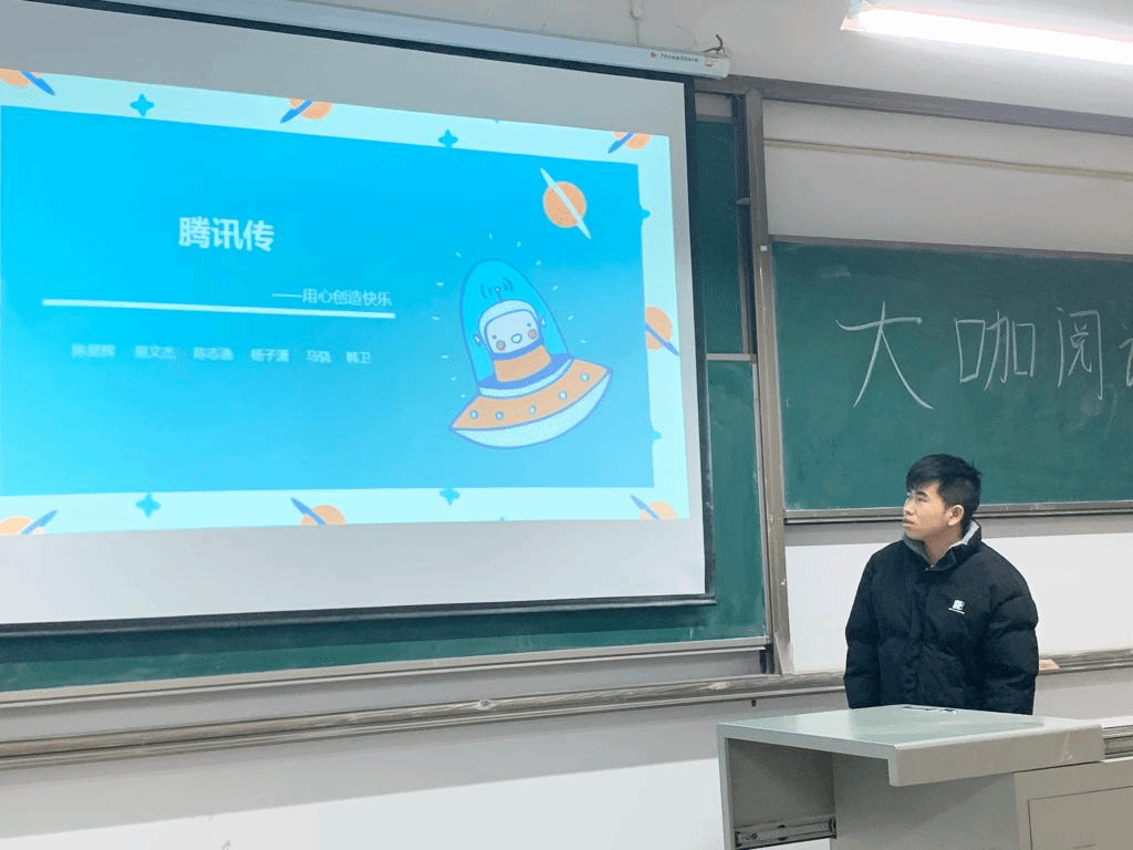 紧接着是韩卫同学分享《腾讯传》。韩韦同学介绍了作者的背景、主要内容、分享了心得与体会。腾讯传全景式地记录了腾讯崛起的经历。腾讯的成功在一定程度上重新诠释了中国在融入全球化进程中的曲折与独特性。当然,这背后也少不了腾讯团队的精诚合作。借此,万垚老师强调:团体的精神是一个团队的灵魂。即使是一个小团队,也应该懂得相互尊重相互帮助。在团队活动中,学会给予团队成员自信和鼓励,而不是戏嘲他人。