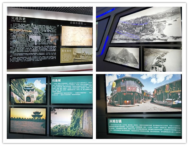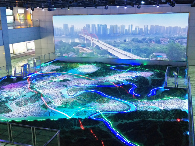 从二层平台看向一层,映入眼帘的便是位于展厅正中心位置的一个巨大的沙盘,而正面的墙上,一幅巨大的LED屏正在播放合川宣传片:“合川,一座底蕴深厚的城市,曾经改写世界历史。合川,一座人文荟萃的城市,贤能辈出声名远扬。合川,一座三江汇流的城市,山紫水明、钟灵毓秀”,同学们纷纷驻足观看。