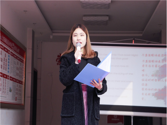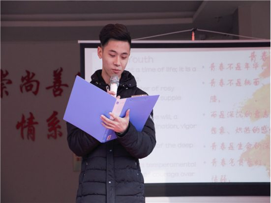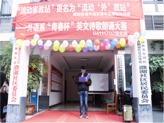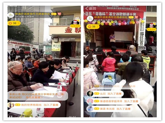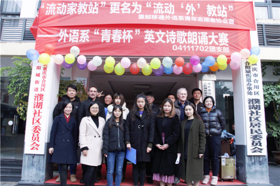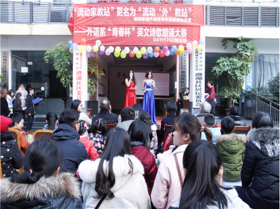 12月,时间悄悄走过了一年。然而,属于12月的回想与深思却才刚刚开始。24日这一天,阳光正好,微风不燥,我们在濮湖社区的金秋老年公寓相遇,第九届“英德语言文化节”之“青春杯”英语诗歌朗诵大赛走出校园。这次比赛十分特别,它的观众大部分是老人和孩子,主要是为了让社区的小朋友们感受英语文字的魅力与大学校园活力,让社区老人与孩子也来一次与外教的邂逅,在潜移默化中增强他们对英语的兴趣,增加一份孩子对社会的美好童年回忆与老人安享晚年的愿望。此次大赛全程通过直播的方式进行宣传,突破了传统的宣传模式,受到校内外5900多人的关注,300余人点赞。