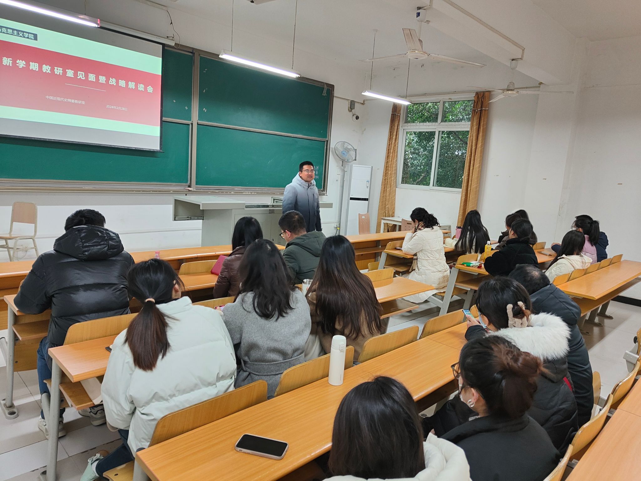 2024年2月28日下午4点,马克思主义学院中国近现代史纲要教研室在教研室主任李阳的带领下,召开了新学期教研室见面暨战略解读会。本次会议旨在加强师风师德建设,提高教师的教学水平和职业素养,同时深入学习和领会学校的战略精神。教研室全体教师参与了此次会议,共同探讨了如何在新学期更好地履行教师职责,为学校的发展和学生的成长贡献力量。