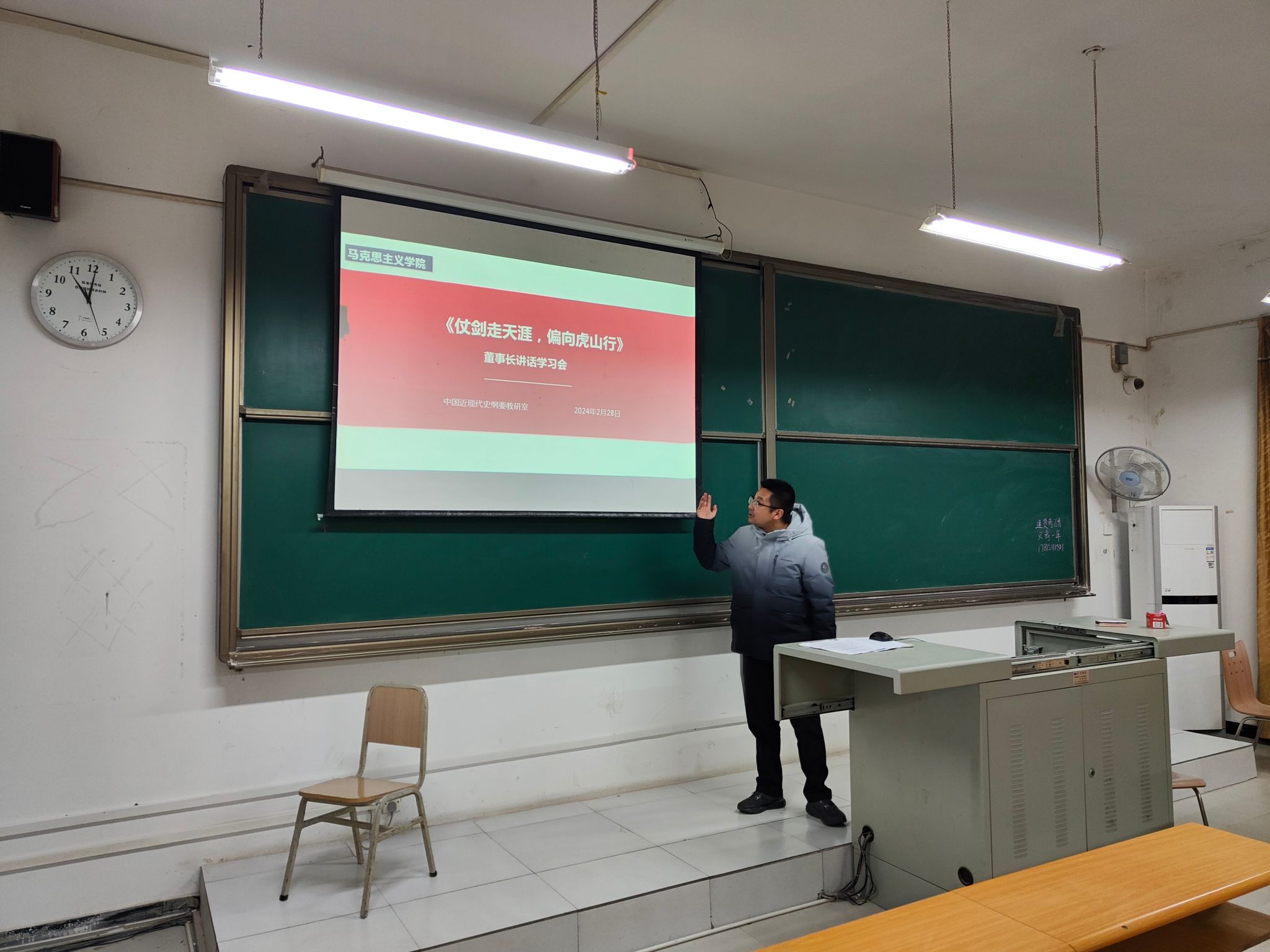 再后,李老师带领全体教师认真学习了彭鸿斌董事长所做,题为《仗剑走天涯,偏向虎山行》的讲话。他要求全体教师要认真体会、领悟和贯彻董事长在讲话中对学校发展战略的重新诠释和解读,特别要求对学校最新提出的建设“双一流之外的首选大学”的发展方向以及打造“四位一体双院制+特色课程”的特色办学模式等内容,一定要入脑入心。他强调,作为马克思主义学院的一员,我们要紧跟学校的发展步伐,不断提升自身的专业素养和综合能力,依托学校搭建的各类平台,建设好“大思政课”,为学校的发展贡献自己的力量。