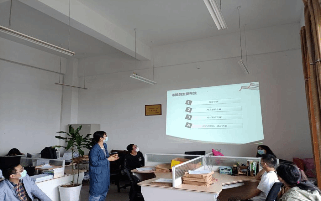 4月陈旭老师开展了“学习常见的诈骗行为,做好各类诈骗的防范”的宣讲活动。陈老师先是介绍了九种常见的诈骗行为,并详细地讲解了各类诈骗的手段、方式、方法,并针对性的给出了这些诈骗的防范和处理措施。随着科技的提高,各类诈骗手段也在不断“进步”,若再抱着曾经的认知来看待如今的诈骗手段,说不定某天就陷入了骗子的陷阱还不自知,防诈宣传一定要多做,要做广,才能让诈骗手段无所遁形。
