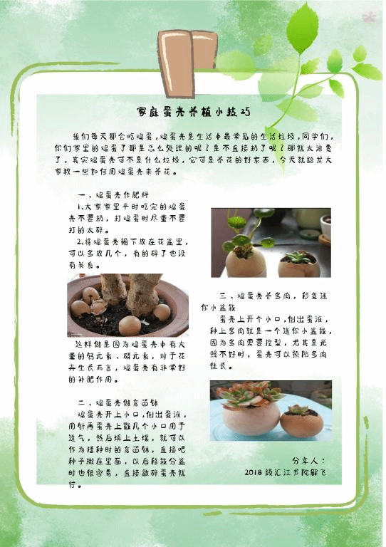“手种黄柑二百株,春来新叶遍城隅。”种植使人身心愉悦,在感恩自然的同时忘却烦恼。同学们选择在房前屋后、花盆里、蛋壳中栽种下希望,几轮日月交替之后,便可看见自己辛勤的美好,阳台上的花香,窗边的阴凉,还有布满眼帘的生机。四月的阳光,使每一株草木都如翡翠繁生,在土地上写着明日之诗。