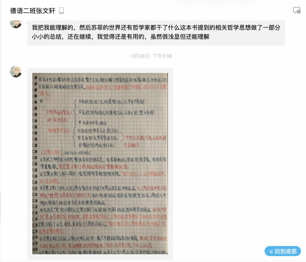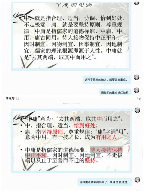 邢静雯老师介绍到,根据课程情况她会发布相应的课程阅读内容要求学生以小组形式完成指定的阅读内容,在小组内进行充分讨论之后形成文字报告,以此把握学生的学习情况。借助现有的qq和超星学习通app等网络教学工具,老师和学生之间可以进行有效沟通并对学生的报告进行时时批复。