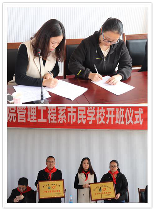 杨进老师与进士社区党委张莎莎副书记、十塘小学杜继红副校长签订《共建志愿者服务站协议书》并共揭共建市民学校牌和共建志愿者基地牌。