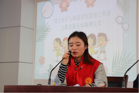 随后,移通学院管理工程系志愿者教师代表杨进老师发表讲话,她表示进士社区市民学校的建立开启了移通学院管理工程系志愿者服务的新篇章,秉持志愿者服务进乡、入户、走校园的服务精神。目前,已有100余名小学生加入和20户住户参与其中,在工作日期间,志愿者将以支教教师的身份在当地老师的配合下,定期参与到十塘小学专门开设的8大兴趣班的课堂中,周末里,则带领小朋友完成课业并充分利用时间以一名小小志愿者的身份走进社区居民家中。“四点半课堂”作为移通学院最具特色和代表性的志愿者服务活动,在今后将会根据受益群体的需求不断完善这个平台。她坚信,在与进士社区和十塘小学的通力合作下,市民学校将越办越好!