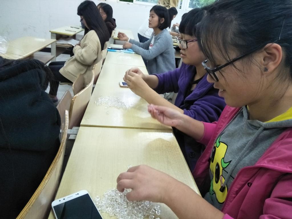 (社员们认真串珠的身影)