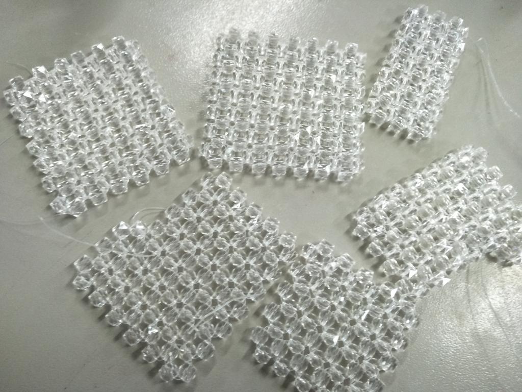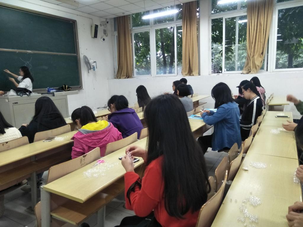 在耐心的一步步穿插中,以及社长们的细心指导下,社员们制作的杯垫逐渐成型。制作过程中,鱼线将颗颗白珠串连,换排换列、改变顺序、交互穿插,每一步都需要格外小心,稍不注意就会错位,导致功亏一篑。