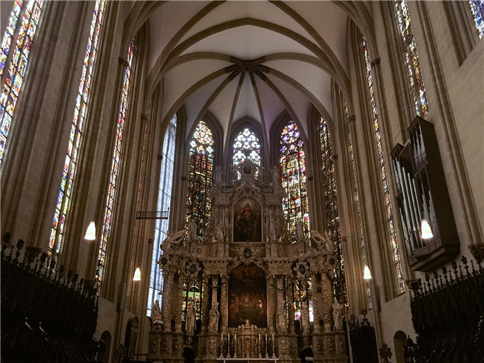 其中,埃尔福特最重要、最古老的教堂建筑——埃尔福特大教堂,是一座具有哥特式建筑风格,有着1200年历史的教堂,被人们称为“圣玛丽大教堂”。从踏入教堂那一刻起,我便深深感受到了它神圣不可侵犯的庄严感,那么的浓烈,压迫人心。现今的大教堂大约建在14—15世纪,整体呈哥特式建筑风格。大教堂内有很多罕见的装饰和雕塑,包括几尊《马太福音》第25章第113节内提到的“十个童女的比喻”雕像,以及明媚的阳光穿过精美的彩色玻璃,让人产生了一种置身于天堂的迷醉感,这些种种都令人震撼。宗教改革的发起人马丁·路德在1507年的时候曾在这里任职。