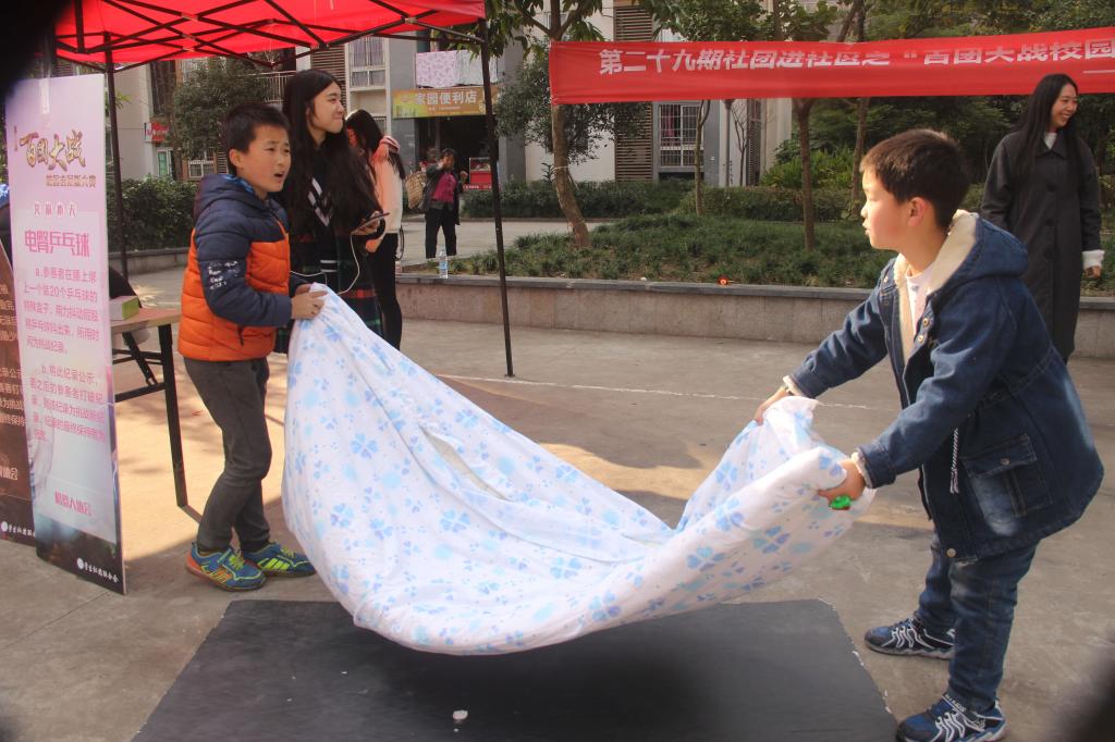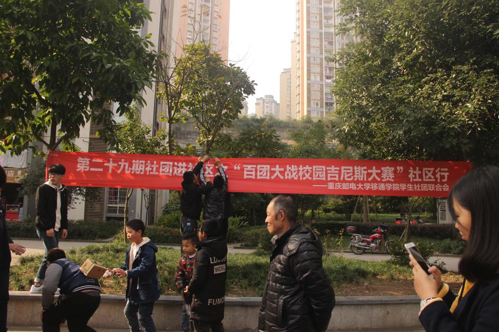 周末的好天气最是难得,在第五届“百团大战”校园吉尼斯挑战赛奋勇拼搏的氛围感染下,我校学生社团联合会携桌游社、舞蹈社等学生社团于11月25日在合阳城街道北城佳苑社区开展了第二十九期“社团进社区”活动,本次活动结合正在进行的“百团大战”校园吉尼斯大赛,将“百团大战”的挑战精神、拼搏精神带进社区,也让社区的市民们参与到我校“百团大战”校园吉尼斯大赛的挑战中,让孩子们尽得其乐,老人们也重拾青春活力。