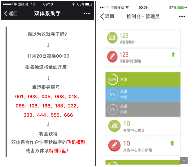 2017年11月20日凌晨0点,双体系第十四期项目部、第六期开发中心学员报名通道正式开启。本次招新创新性的加入了抽奖环节,凡是中幸运报名号的同学,都将会获得双体系合作企业春秋航空赠送的飞机模型或者双体系特制U盘。幸运报名号的设立,极大地激发了同学们的报名热情,20日凌晨0点报名通道刚刚开启不到十分钟,报名人数便突破了100人,幸运报名号的争夺异常激烈,仿佛再现了前几天天猫双十一的热烈景象,可谓是双体双十一。