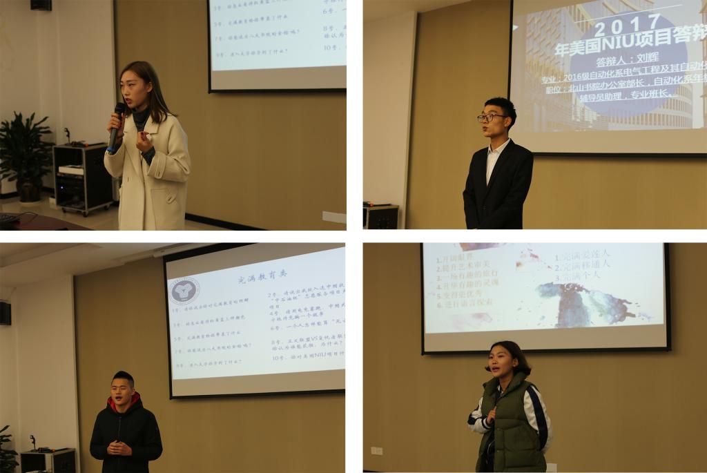 11月29日,2017—2018学年寒假赴美国NIU短期交流学生选拔在行政楼107如火如荼地开展着。前期经过各院系辅导员的推荐与学生自主报名,共有50名选手进入到终选答辩环节,他们都发挥出最佳状态展现自己的个人风采。选手们将分为完满教育组和全院海选组,其中流程包括自我展示和随机抽答。同时也邀请到了国际处韦橙橙老师、各院系辅导员、完满教育各版块负责人以及书院部老师,并由学生院长助理团全程监督此次选拔。