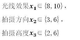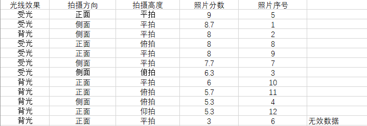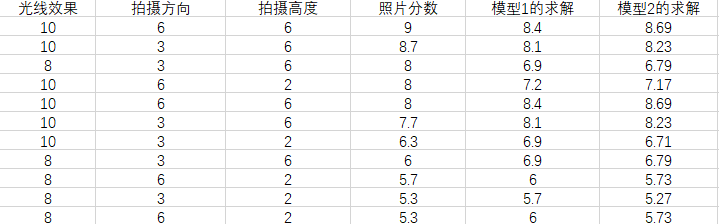 发现分数靠前的都是受光,所以可以考虑光线效果是影响图片效果的最重要因素,所以光线的权重应该是最大的,其次是拍摄高度,最后是拍摄方向。于是定下最初的权重比0.6:0.3:0.1,同时在Matlab上也进行回归方程的计算,最后得到了最终的权重比0.7194:0.1538:0.3798,随机数取-1.7081