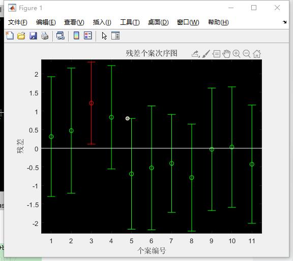 的求解,我们发现一共11组数据,只有一组数据的求解偏差较大。在Matlab上获取残差个体图,发现也是只有一组数据存在较大的偏差(红线)