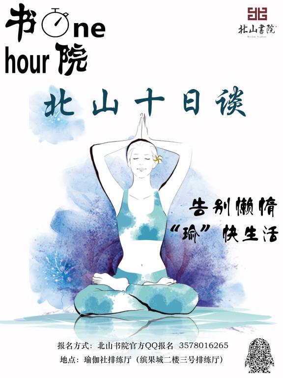 有人说:适当的慵懒有益思考,过度的颓废会使人堕落。为了同学们能积极参与更多的活动,告别周末窝在寝室的生活,走出宿舍,与“颓废”说再见!同时营造轻松愉悦的气氛,为同学们缓解学习、生活上的压力。2017年12月2日晚19:00-20:00,北山书院于缤果城二楼排练厅一开展本次北山十日谈之告别懒散、“瑜”悦生活活动。
