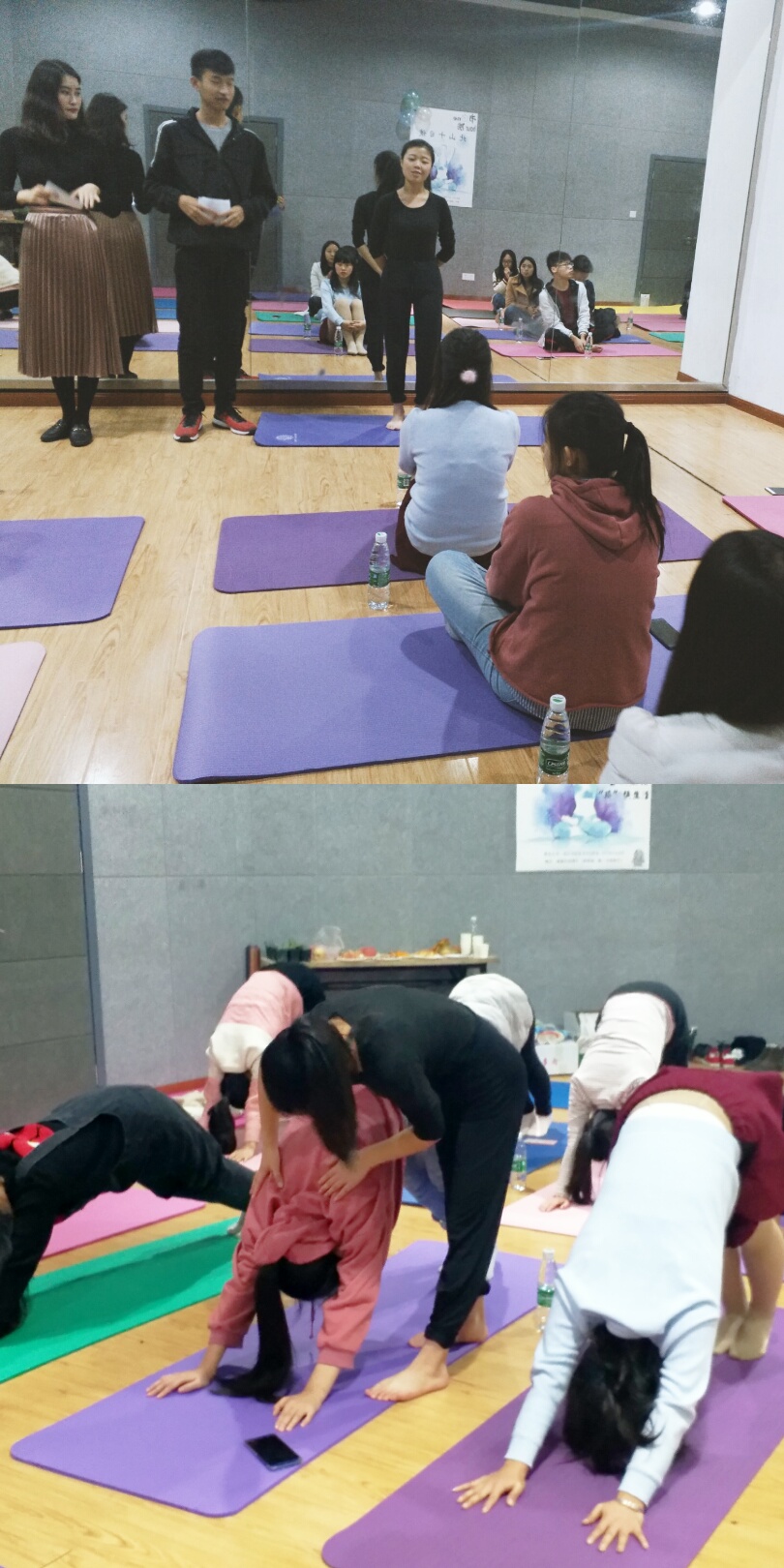 在柔和的音乐响起时,活动正式开始,主持人介绍此次活动的开展的目的及意义。接着就是我们邀请的瑜伽社社员作为老师来带领大家完成此次瑜伽活动。本次瑜伽活动大致分为四个部分:入定,入定姿势的主要是让练习者在半莲花坐姿上调整呼吸保持一段时间,在入定中,练习者不能熟睡,姿势越稳定越能意守;关节柔软练习,主要是进行加强关节的柔软性,使得练习瑜伽时能有更好的柔软度;拜日式,由十二个姿势组成,可用于热身,有利于舒展身体,平和内心;平衡姿势,瑜伽树式不仅可以活动到全身的关节,还能促进各关节的血液循环。热身结束,不少同学也不再有刚来时的寒意。
