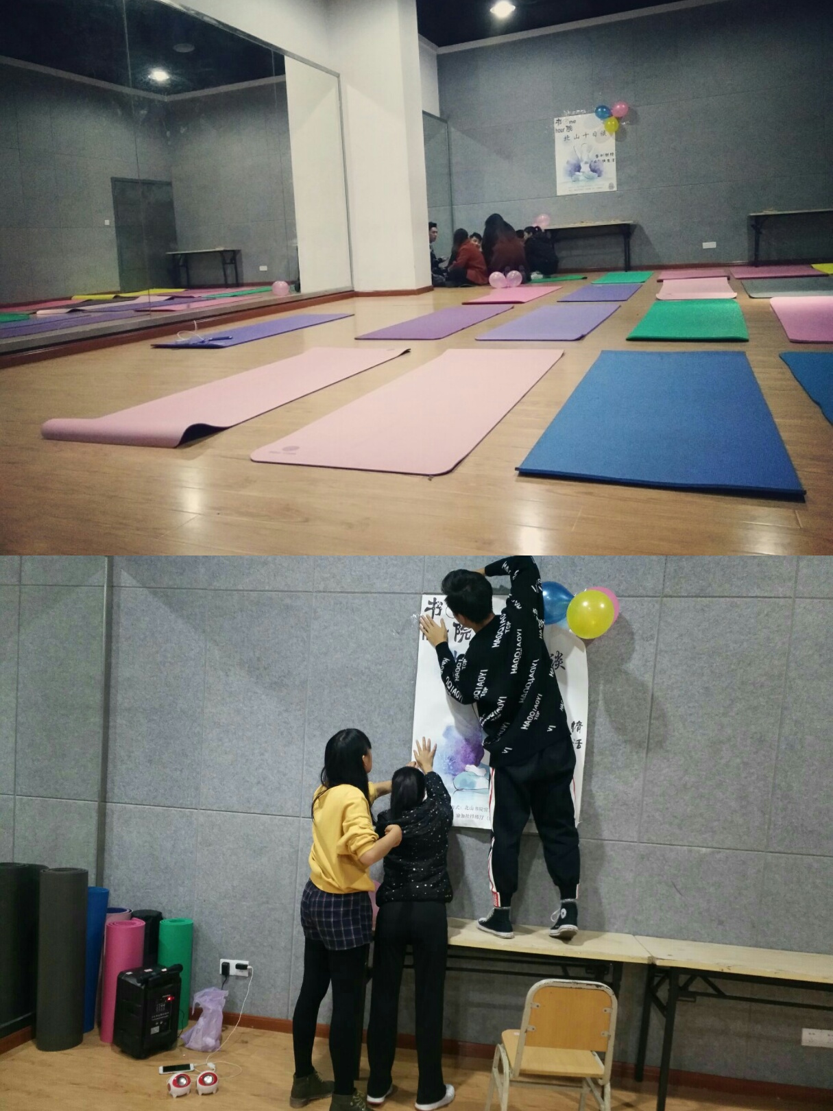 下午16:00,我们北山的工作人员们准时来到活动地点,积极的为此次活动布置出一个完美的场地。扶梯上粘上气球,是为了参加人员快速、明确的找到我们的活动场地;借来工具打扫卫生,是为了给同学们一个舒适的练习环境;零食水果、瑜伽垫的整齐摆放以及地板的一尘不染都是我们对北山学子承诺,身在北山,感受家的温暖;作为北山人,坚持、勇敢、自信就是我们的标志!