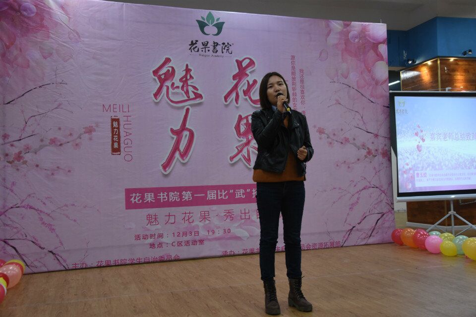 活动最后,由花果书院学生自治委员会综合办主任曹玉姣老师对本次活动作出总结,对本次活动的流程非常满意,也指出了其中的不足的地方还有待改进,强调了我们花果书院的宗旨是以感召力来发动同学参加本次的活动,而这次活动也是对感召力的一个诠释,这是一个属于平民的大舞台,更是给予了其他同学信心,希望下次的活动能更展现我们花果书院的特色与同学的风采。