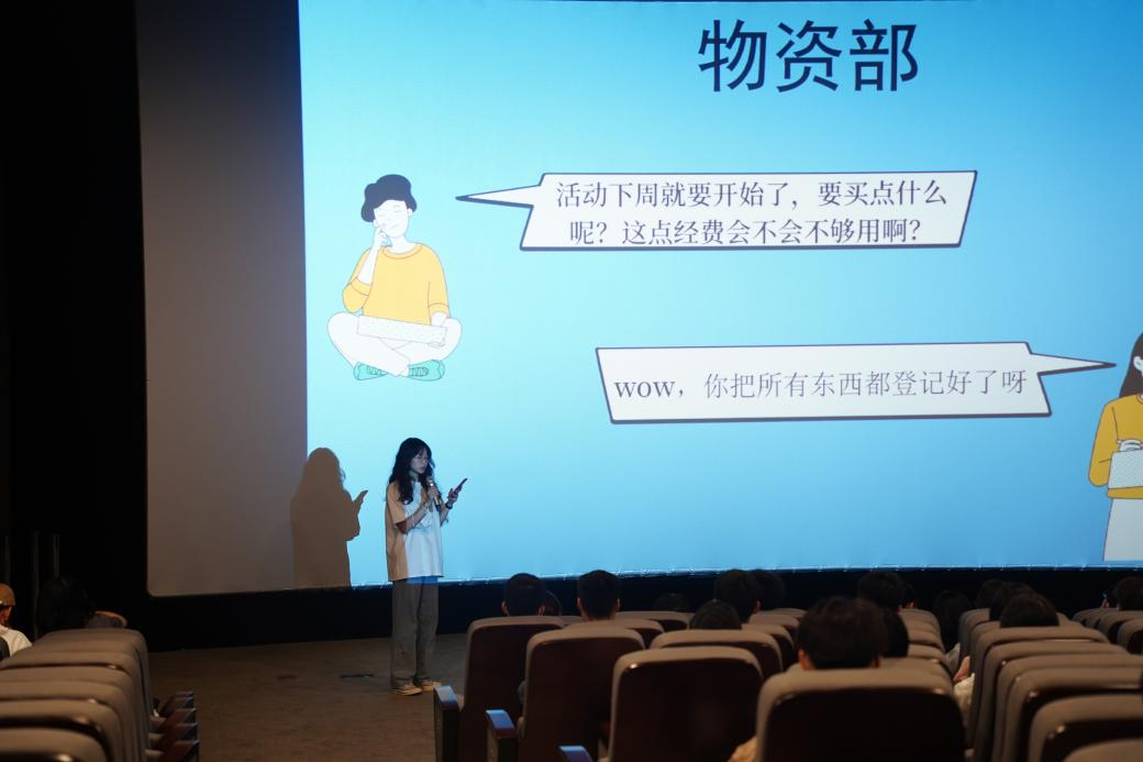 作为电影评论中心的直属社团,王社长向大家推荐了电影评论中心的各项电影训练营活动,如电影播客训练营、电影策展人训练营、电影手账训练营、手机影像创作训练营、影评人训练营以及字幕翻译训练营等等,训练营的开展,不仅是为了拓充影协成员的兴趣爱好,同时践行着“四位一体”的育人模式,培养学生实践能力、思维能力,让社员们在学习的过程中也能追逐电影梦。