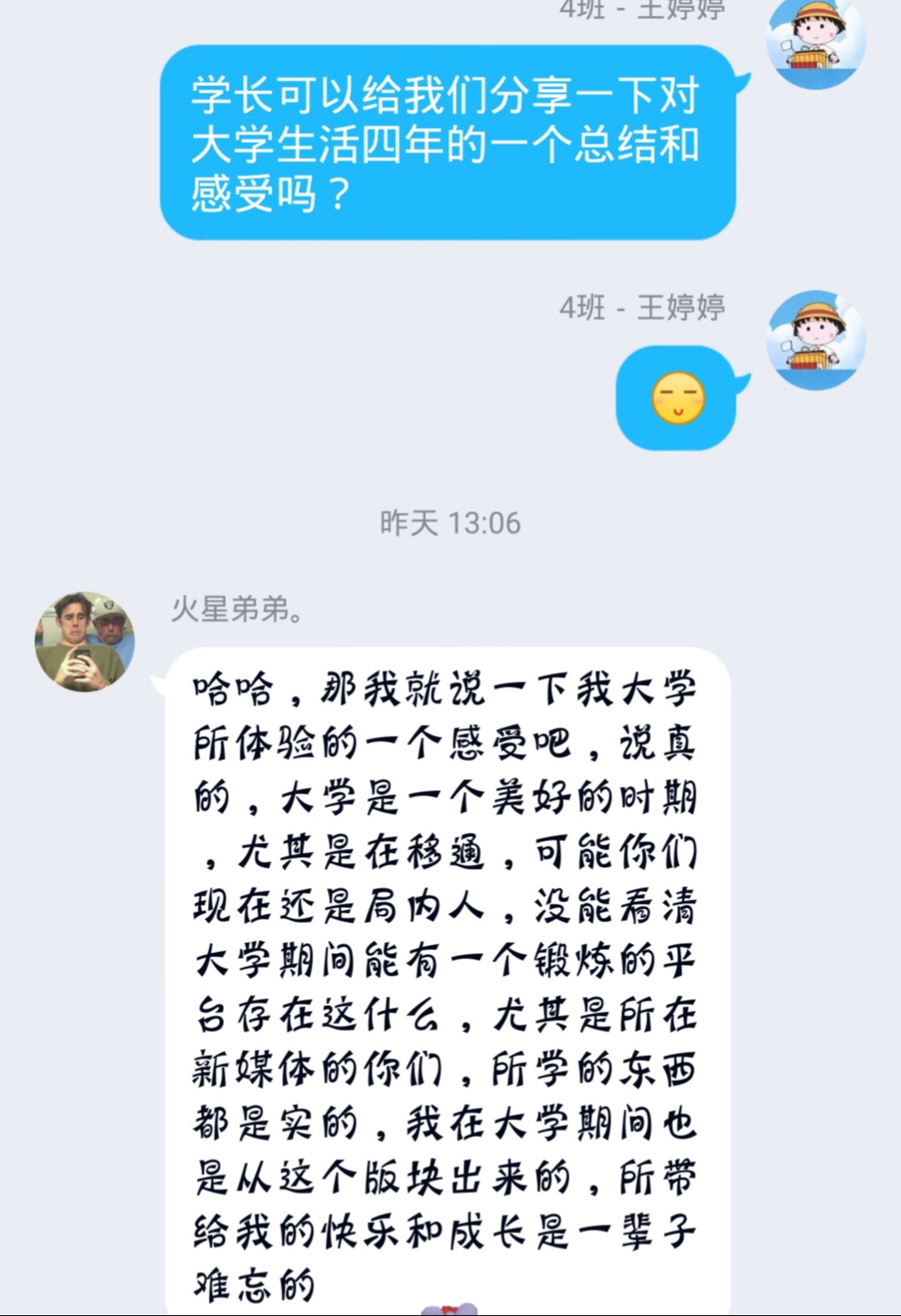 “大学是一个美好的时期,尤其是在移通,可能现在有些同学还是局外人,没能看清大学期间能有一个锻炼的平台存在着何种意义,但大学参加完满教育活动,所学的知识及技能都是实用的,尤其是新媒体,并且大学带给我的快乐和成长是一辈子难忘的。”