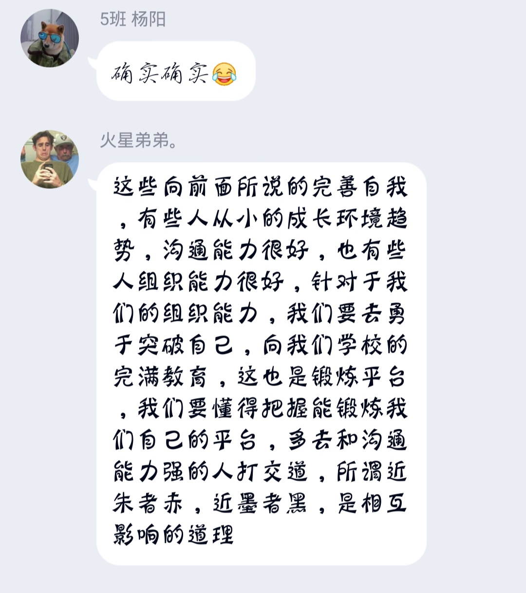 答:“勇于突破自我,学校的完满教育就是一个非常棒的锻炼平台,大家要懂得把握能锻炼自我的平台,多去和沟通能力强的人打交道,所谓近朱者赤,近墨者黑,是互相影响的道理。”