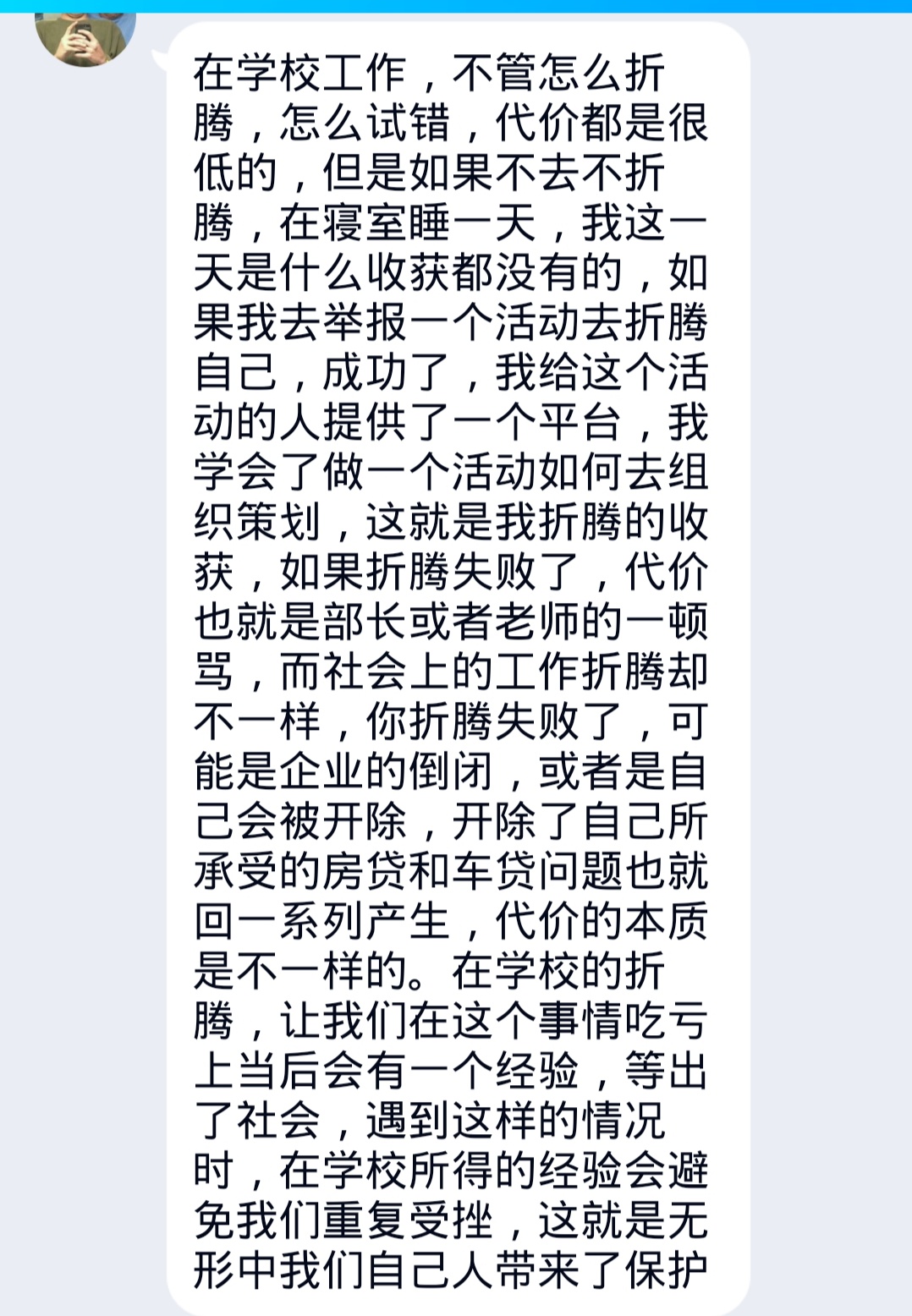 答:“在大学里折腾出了错,代价最大也就会被骂几句,而进入社会代价就很不一样了,那可能是降职,减薪,甚至是炒鱿鱼。所以建议大家在学校多折腾,在学校经历的越多,进了社会吃亏就越少。也就是你选择什么样的道理,就会有什么样的结果。由此可见,大家一定要利用好大学的这把保护伞,敢于锻炼,敢于试错。”