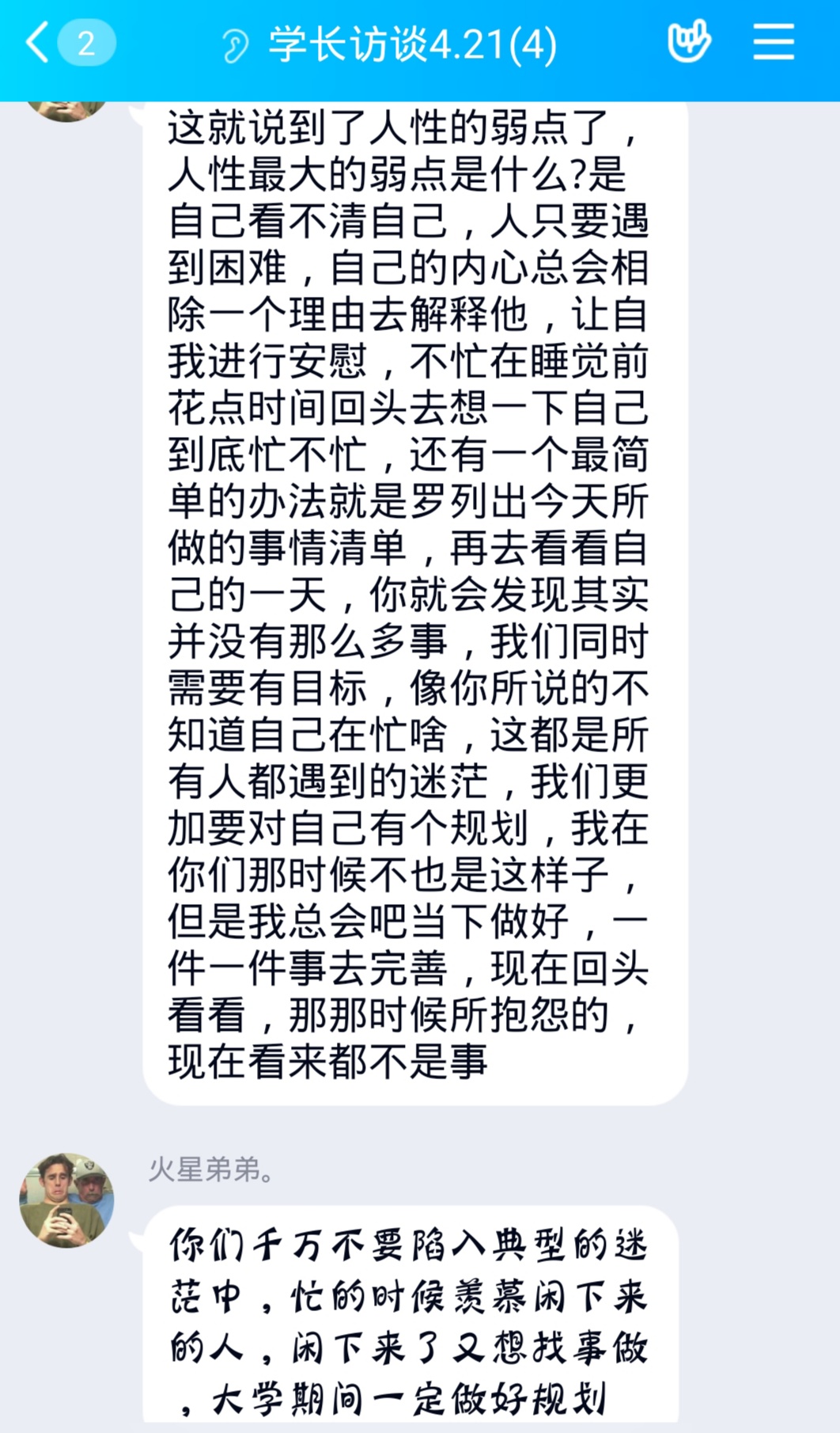 采访临近结束,学长告诉同学们:不要因为麻烦而放弃学习。每个人都会有弱点,没有人天生就喜欢忙碌,所有人都向往安逸的生活,但是怠惰只会给未来带来更多的忧患,同学们要把握好大学的生活才能拥有更好的未来。