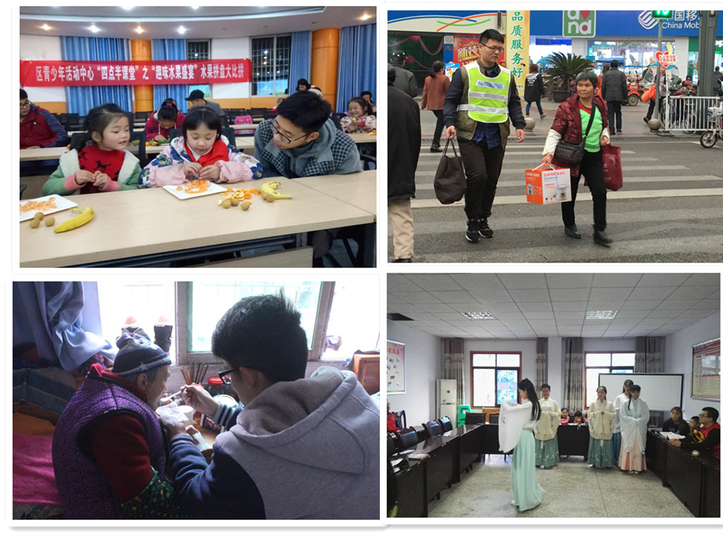 “品经典·学国学”志愿支队,每周六定期的前往社区基地,和基地的小朋友一起观赏汉服社古风柔情、体验汉文化的“子曾经曰过”,他们在国学的海洋里遨游着。以骄阳为伴,与风雨为友,“知交规·行安全”志愿服务支队,川流不息的车辆呼啸而过,一幕一幕在眼前飞逝,志愿者始终带着微笑,用自己充满爱的双手去帮助别人,他们行交规,传公益,献爱心。骄阳似火,夕阳不落,“爱心之旅”敬老院志愿支队,在熟悉的旋律中,老人在院子里回忆曾经的美丽,用余下的生命来回味与享受志愿者的爱。科技引领生活,科学改变命运,“智造时代·自动乐园”志愿支队,他们用科学知识去引领合川“潮流”,让每一个中小学都拥有一所科普基地,这将是他们的梦想,也是机器人“小智”的未来。用你我爱心,换人间真情,守护“折翼天使”志愿支队,看着“天使”脸上那纯真的笑脸,志愿者的心融化了,他们愿意用一生去守护,用世间最美好的爱去呵护。如果非要在这份爱上加一个期限,我希望是一万年,爱的N次方“志愿支队,他们如一缕清风,在每天的四点半,轻轻的拂过小朋友的心间,暖暖的。