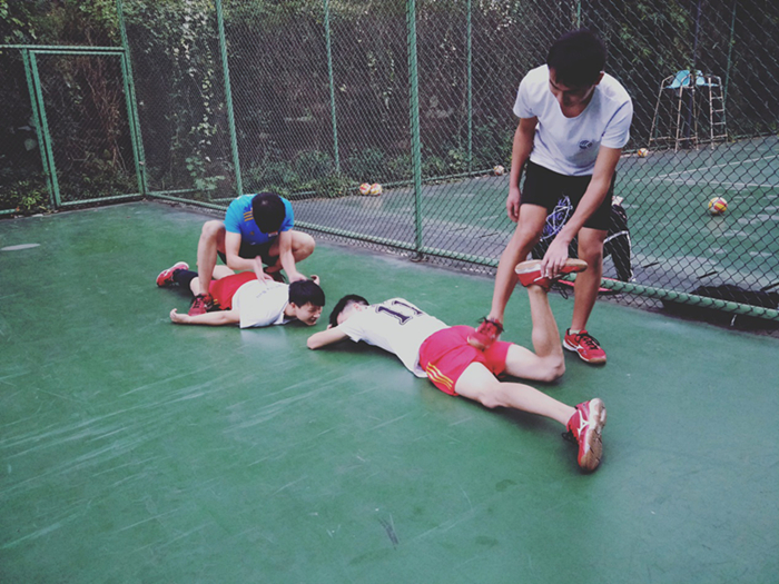 因此,在这段时间的训练中我们在教练的带领下开始在队内以各个系为单位进行对抗比赛。在训练中队友们也都积极的投入,虽然我们代表的各自院系,但在场下我们依然好兄弟,因为我们都是一个大集体、大家庭。在日常的训练结束之后大家都会为队友放松肌肉之类的,从而来增进大家之间的感情。