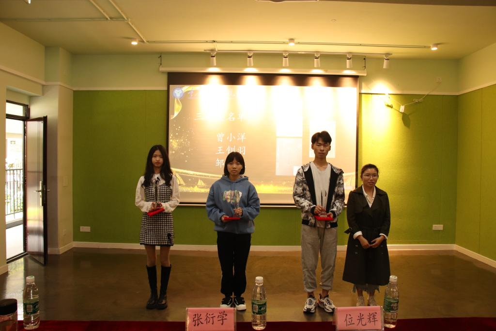 罗晓霞老师为三等奖获得者的邹祖权、王钏羽、曾小洋等3名同学颁发荣誉证书及奖杯。