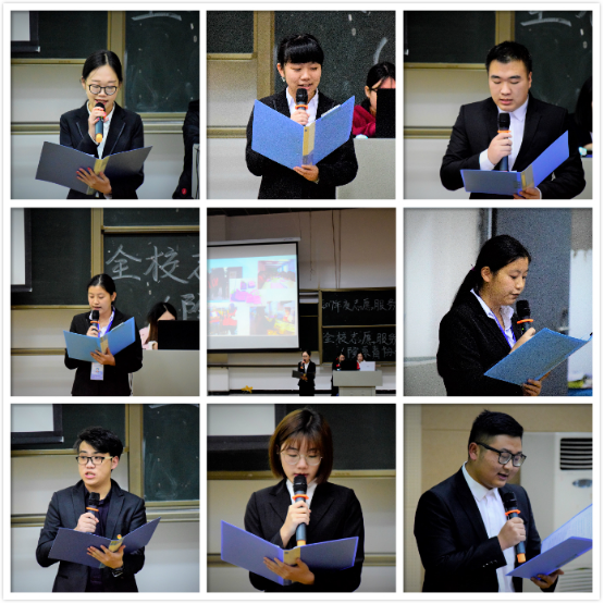 在总结中提升、反思中整理新思路、新目标。2017-2018学年第一学期全校志愿服务组织总结答辩会共举办两场,由我校九大院系青协代表和二十七个志愿服务专项支队开设两个专场的总结答辩。