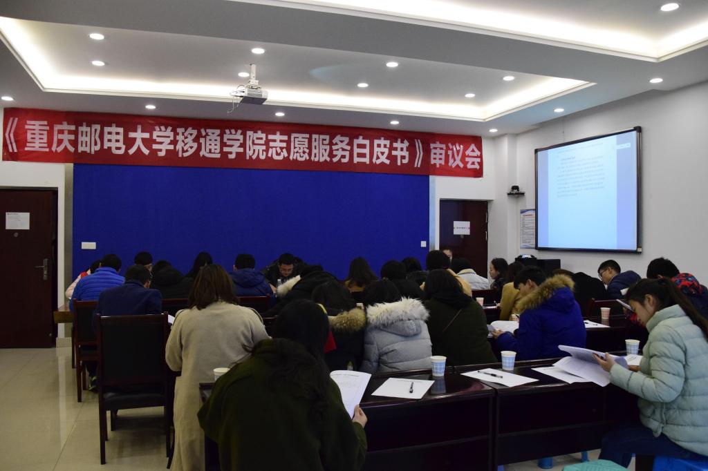 为广泛采纳基层对白皮书的意见和建议,完善我校志愿服务体系, 2017年12月18日下午三点召开重庆邮电大学移通学院《志愿服务白皮书(草案)》审议会。由我校志愿服务版块指导老师唐彬文老师、各院系指导老师代表、从事志愿服务工作的学生代表共同讨论提出白皮书中所存在的问题,然后现场商讨整改,集齐众人看法,完善重庆邮电大学移通学院《志愿服务白皮书(草案)》。