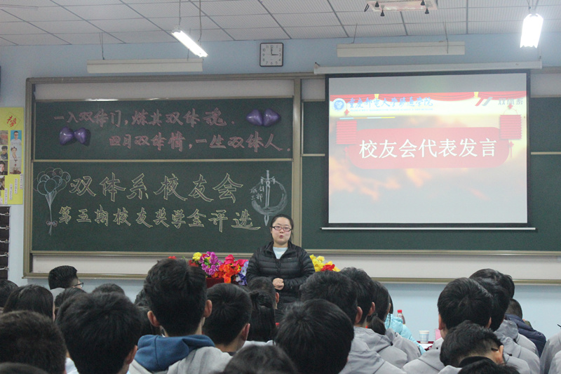 随后,双体系校友会理事、双体系一期学员霍佳璐分享了她的双体生活,通过她的自身经历告诉双体学子:“现在回想起双体的生活,有很多的遗憾,但都将会是你成长过程中的一种收获”。同时也告诫双体十三期即将走向工作岗位的同学们:“不要畏惧前路的坎坷,只有经历过痛苦的人生,才是完满的人生”。