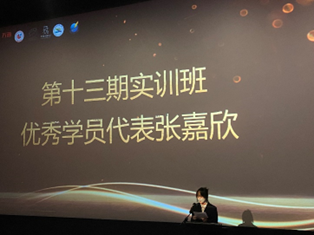 典礼中,第十三期实训班优秀学员代表张嘉欣发表了感言,分享了她在实训班学习的心路历程和成长体会。她表示在实训班的学习不仅让她更加了解电影、热爱电影并得到了技术上的提升,更是对团队协作和创意思维的锻炼。