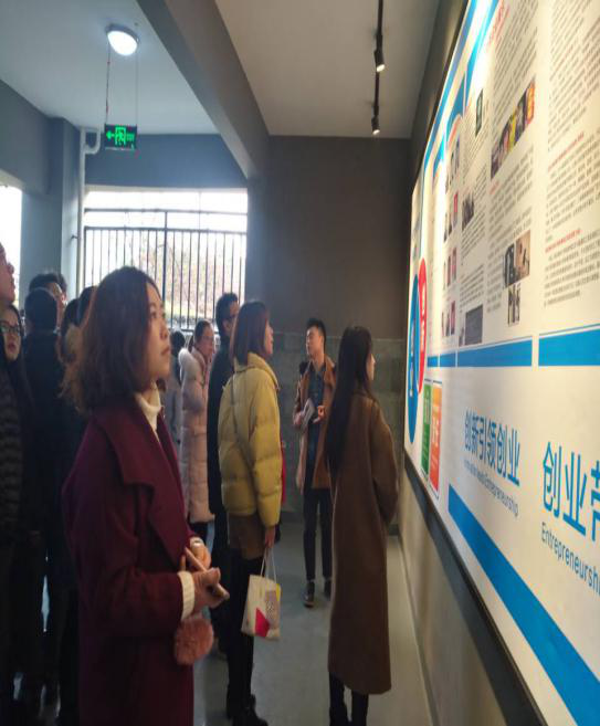 随后,各院系教师参观团来到位于创业基地二楼的大学生创新创业孵化基地文化墙,文化墙上不仅包含了作为一个创新创业业者所需的最基本的创新创业精神,还包含一个创业团队所必须具备的责任感。文化墙分别通过对我校创新创业相关政策的解读、创新创业导师的简介、优秀孵化成功企业及优秀在孵企业的展示、优秀创业者代表、在孵企业展示等几个板块向各院系教师参观团全方位的呈现了我校大学生创新创业孵化基地的经营情况,取得的成果。同时,杨德龙老师、秦友老师还就各个老师都关心的在校大学生入驻基地的流程、政策等进行了详细的讲解。