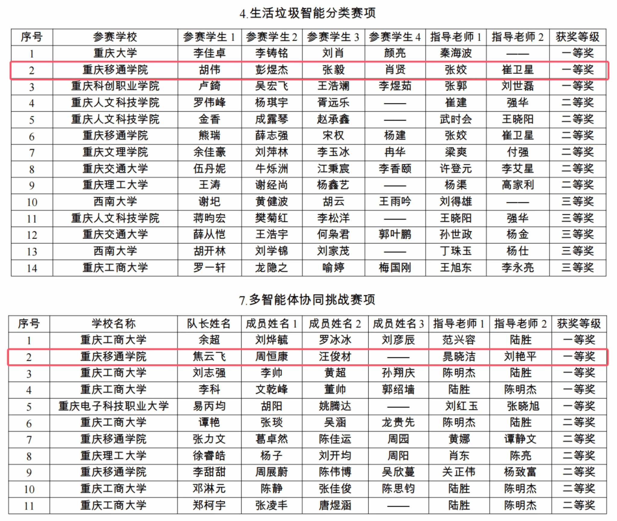 在比赛进程中,我校各参赛选手们向评审专家和观众充分展示了他们在工程实践与创新领域的扎实基础和出色才能。经过现场激烈角逐和严格评审,围绕项目创新性、实用性、技术难度和团队协作等多个方面评选出一批优秀获奖作品。重庆移通学院在各赛项中均斩获佳绩,其中我校首次参赛多智能体协同挑战赛项、生活垃圾智能分类赛项、企业运营仿真赛项、工程场景数字化赛项共荣获一等奖2项、二等奖4项、三等奖7项。另外,重庆移通学院荣获“优秀组织单位”荣誉称号;张姣、崔卫星、晁晓洁、刘艳平几位老师获得“优秀指导教师”荣誉称号。