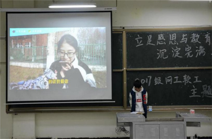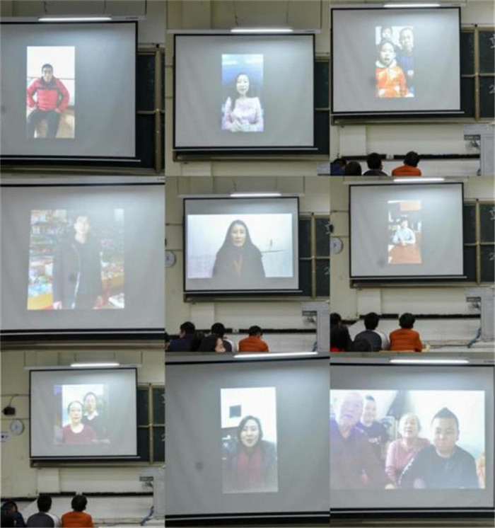 感恩的主题在同学们的掌声中结束了,但辅导员马喆老师却给同学们带来了礼物。身处异乡几千里,对父母的思念只言片语岂能说明。尽管手机在手中,电话可以随时打、信息随时都可以发、视频可以几周开一次,但是很多时候由于羞涩,父母还是有许多心里话没能向同学们表达。借着年级会的这次机会,辅导员马喆老师与家乡在千里之外的一些同学的家长进行通话,并收到了一段段满是期盼与关心的视频。经过剪辑,视频在最后环节播放出来,当熟悉的面孔出现在大屏幕上,用再熟悉不过的声音表达着对自己的关心与期望时,同学们脸上的表情由惊讶到开心到最后湿了眼眶,气氛一下变得温情起来。辅导员马喆说到:“希望,这份礼物你们能喜欢。”