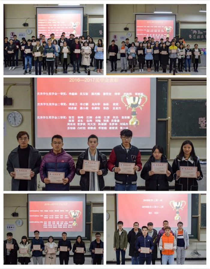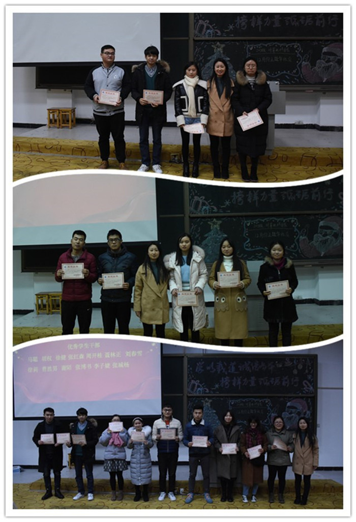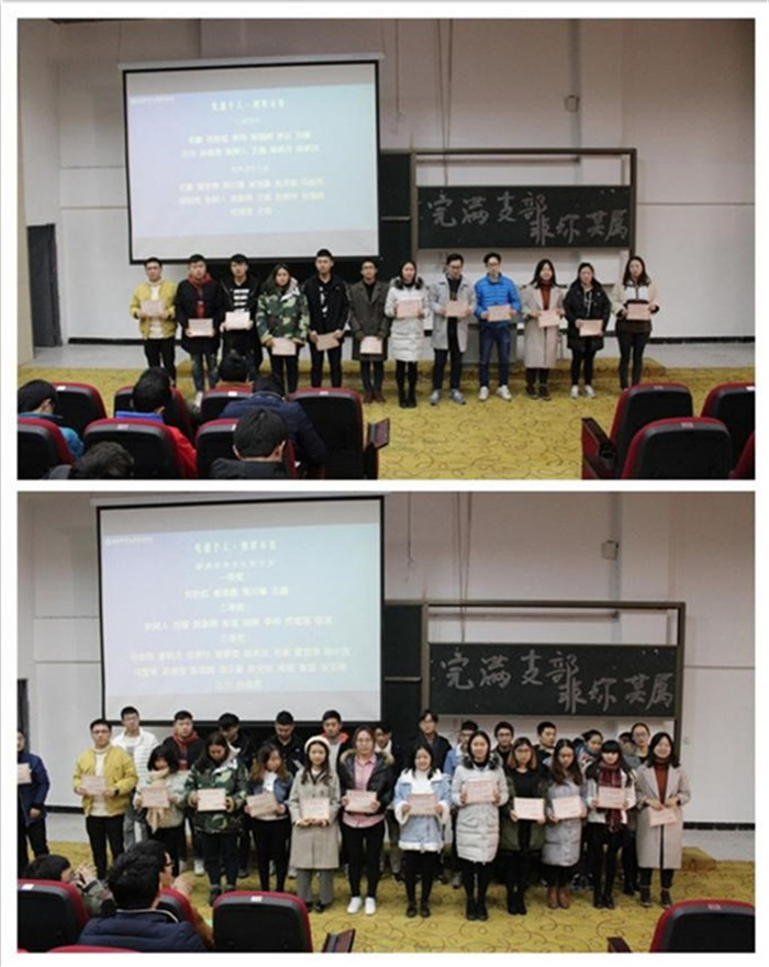 本学期的时光说过就过去了,回头一看,满满的全是回忆,满满的全是收获,最重要的,还有经过这四个月的努力赢来的荣誉,我们的一个值得骄傲的荣誉的学期。接下来由年级长黎云中同学宣读了2017-2018学年第一学期获校奖学金、优秀学生干部、三好学生等先进个人名单并由辅导员童学容老师为他们颁奖。