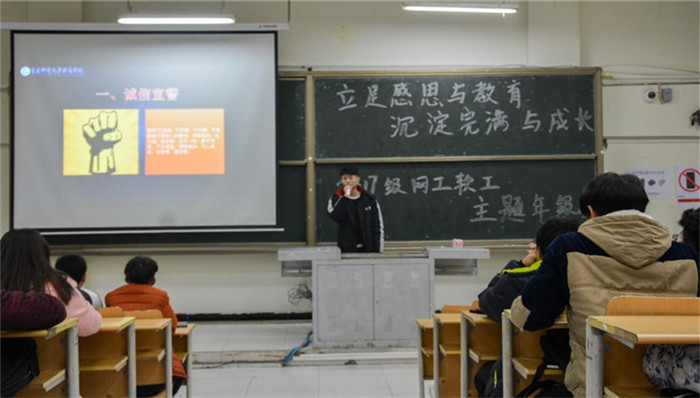 羊有跪乳之恩,乌鸦有反哺之情。感恩是华夏古老民族的精神。如今更是不能相忘,今天的第一个主题是感恩教育,但却是软件工程3班的班长王泽宇同学来为同学们分享。虽然“感恩”这两个字已经成为老生常谈的话题。但不同的是,王泽宇选择了3段视频以三个方面为同学们展示了“感恩父母”、“感恩老师”、“感恩社会”。视频播放时,同学们不时被视频中有趣的情节引得哄堂大笑,又被那些动人的举动润湿了眼眶。尽管王泽宇同学没有用过多的言语对感恩这个词进行解释,但他的想法通过视频已经引起了同学们的共鸣。