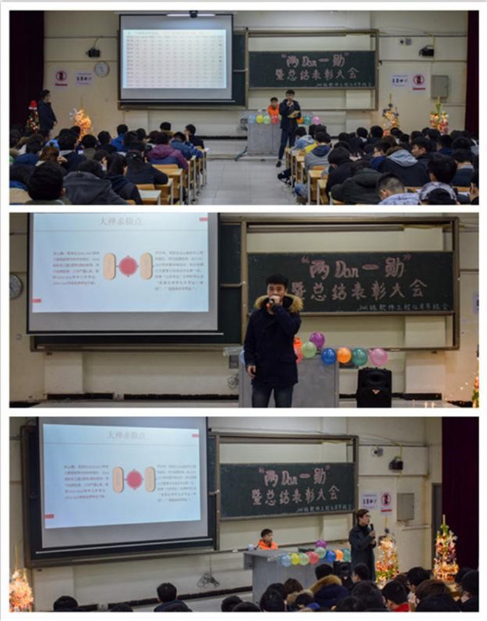 欣赏过春花秀美,感叹过夏花烂漫,崇敬过秋花高洁,品味过冬花傲寒,2017即将落下帷幕,正在缓缓的拉开2018的序幕,在学期末总结沉淀表彰优秀,反思自我正是自我发展进步的渠道。2016级软件工程于2017年12月24日在3101召开了十二月份年级会。在本次年级会当中,首次采用支部参与组织,让学生从观众成为年级会主体,做学生自己想要的年级会,表达对已经过去一年的反思与总结,并对在2016-2017优秀先进的班集体,文明寝室,先进个人等进行了表彰。出席此次年级会的有2015级辅导员任瑞娟老师,2016级辅导员吴垟成老师,2015级优秀学长洪上朗学长和2016级软件工程全体同学,现场气氛热烈,收效良好优质。