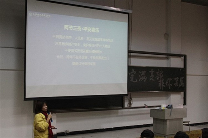 为确保圣诞节、元旦节期间学生文明离校、安全返校。辅导员童学容老师重申校园安全措施,就交通安全、食品安全、旅游安全等方面对学生进行安全教育,以确保学生在思想上高度重视安全问题。辅导员童学容老师主要强调以下三点: