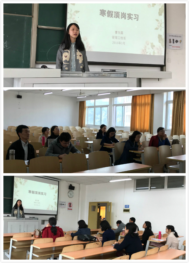 为推动我院工程管理专业人才培养与行业的有效对接,响应学院专业人才培养理念,创新工程管理专业教育,提升教师教学质量,在学院领导的大力支持下, 寒假期间,管理工程系张红老师应邀参加《造价及2017年施工合同解读》高级培训班,曹友露老师带领工程管理专业两位同学到校企合作单位的实体项目进行顶岗实习。3月14日,两位老师就学习收获向全体老师进行了分享。