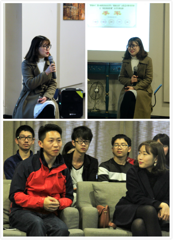 带着灿烂的笑容,爽朗的声音,邹羽校友和学弟学妹们做了深入交流,在大学期间,她一直以“我心向阳,定能芬芳”为座右铭,松紧有序的忙碌,找到自己喜欢的东西,并为之坚持是邹羽大学生涯的最好写照。积极参加各种社团活动,校内的广播站、大艺团、英语社、系学生会、辩论队、创业学院都有她的身影,并且在演讲比赛、辩论赛、经典诵读大赛上都获得优异成绩。正是她这样永远抱着学习的心态积极参与各项活动和比赛,因为热爱所以去坚持,在毕业后也因为大学期间带给她的经验,找到了自己喜欢的工作,并为之奋斗。交流会中邹羽和同学们积极互动,分析和回答了现在学生存在的烦恼和问题。以在一名毕业校友和曾经的学姐身份为同学们答疑解惑,让大家受益匪浅的同时也能够认真反思现在的大学生活。