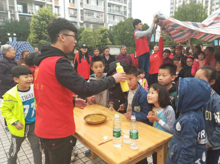 在小品结束之后是便是一系列的神奇、有趣的小实验。在活动现场志愿者依次为居民们展示了关于压强、化学反应、扩散现象等九个实验。奇妙又不可思议的实验现象,激发了小朋友们对科学的兴趣。在实验进行过程中,小朋友们的双眼紧紧盯着实验台,当看到神奇的现象发生时,他们充满了好奇心,迫不及待的想要知道答案。通过现场实验,小朋友们更加的热爱科学,也对科学充满了好奇,急切的想要去探索科技的未知世界,翱翔在科技的蓝天上。